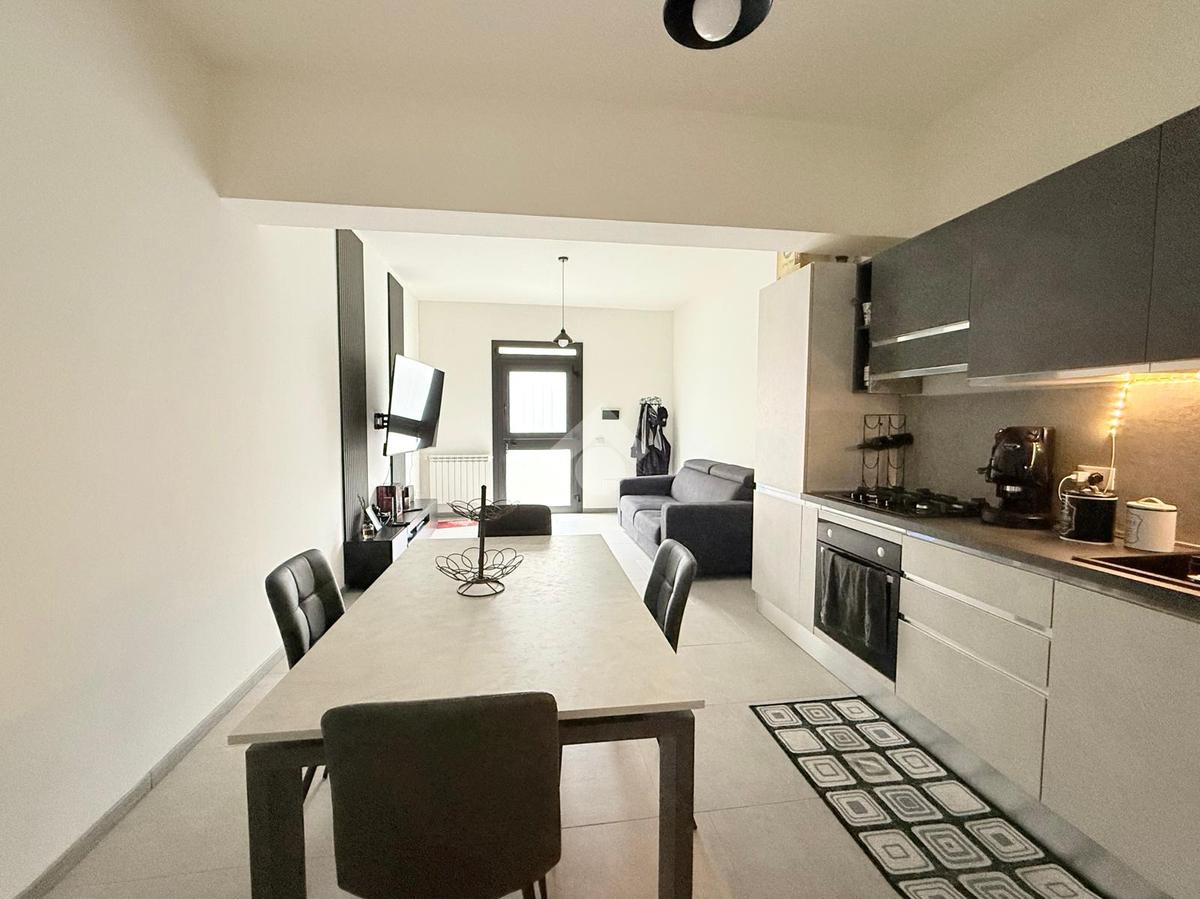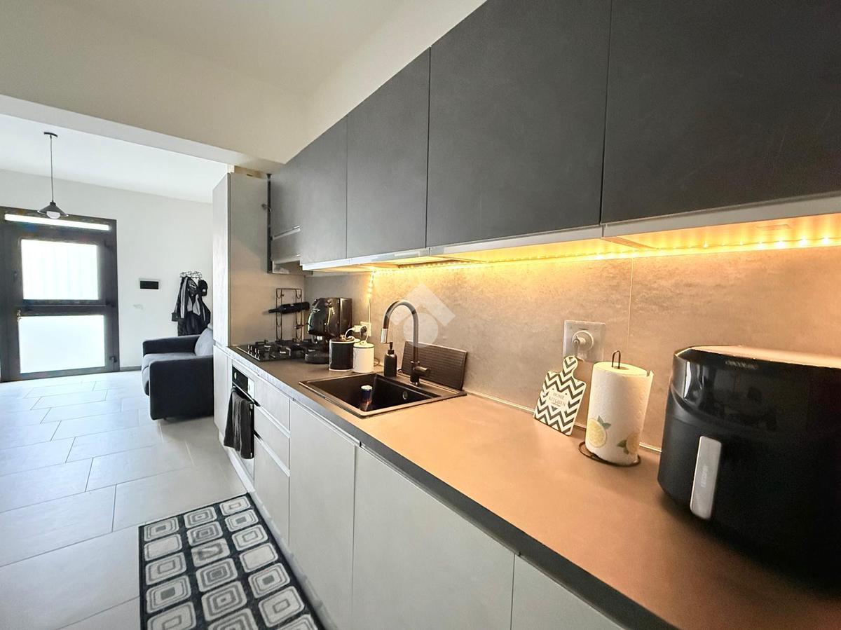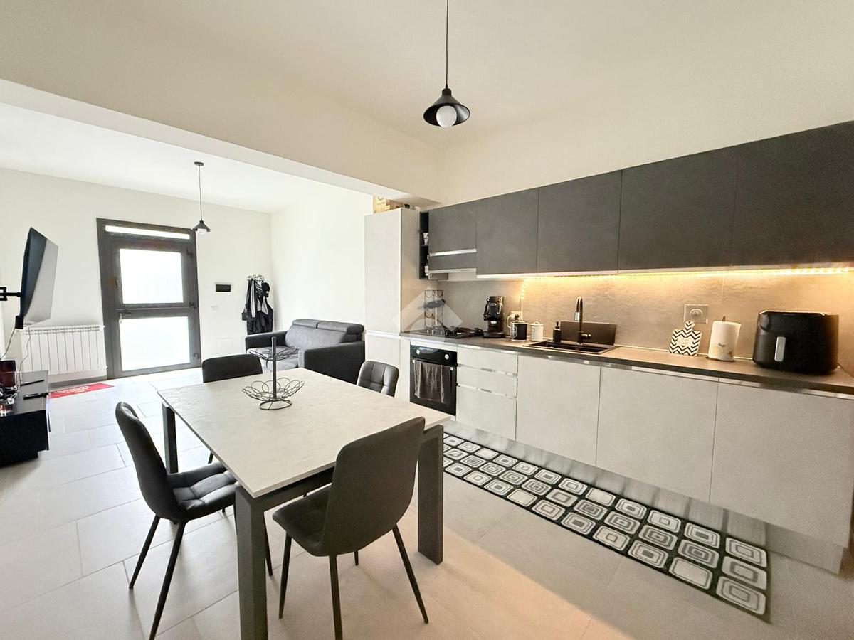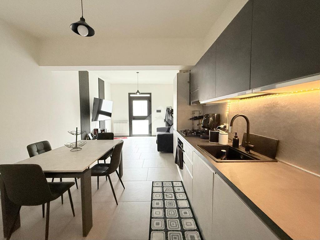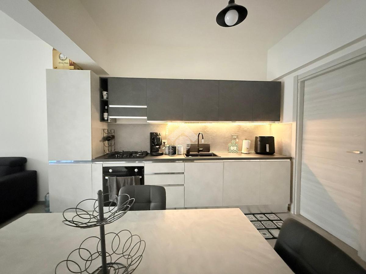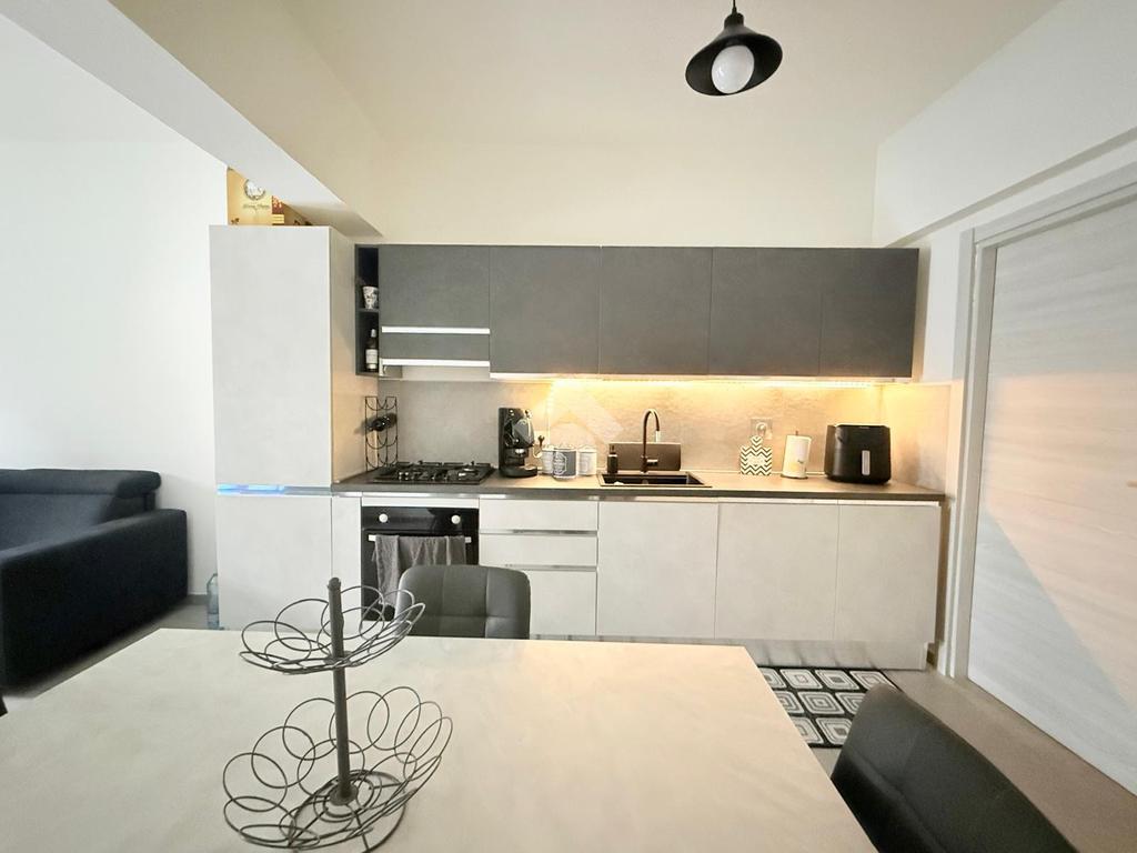 L'ingresso si apre su una luminosa zona giorno con soggiorno e cucina in open space, caratterizzata da un arredamento moderno e ben organizzato, pensato per sfruttare al meglio gli spazi.